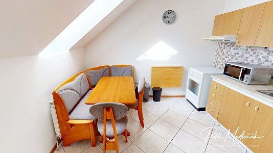 Pozostáva z obývacej izby, balkóna, kuchyne s jedálenským sedením, chodby, kúpeľne s WC a po schodoch sa dostanete do spálne.